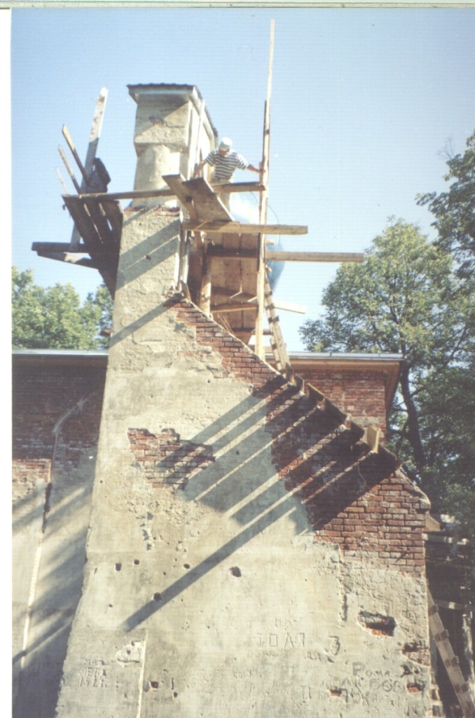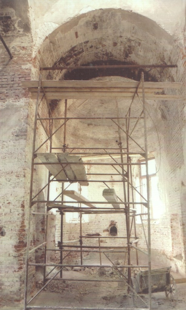С осени 1994 года о. Игорь занялся восстановлением храма. Начались работы с вывоза мусора, отсыпки и выравнивания площадки у храма. Проведён демонтаж ветхих кровельных конструкций и каркаса руинированной главки, собран каркас новой главки, установлены кровельные конструкции, осуществлен монтаж кровельного покрытия, установлен крест.Были демонтированы бетонные ванны для охлаждения молока, восполнены утраты кирпичной кладки растёсанных оконных проёмов на северном и южном фасаде, восстановлены конструкции перекрытия и настила пола, установлены двери и окна, произведены штукатурные работы.